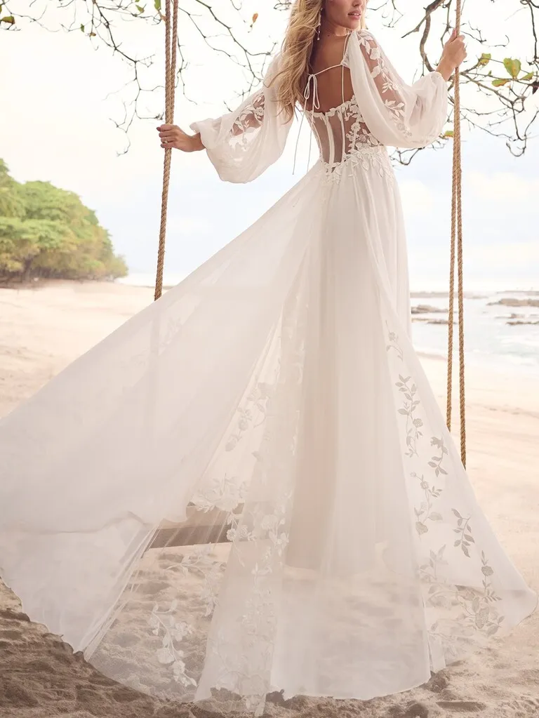 La espalda acorsetada con transparencias es el gran protagonista del diseño, aportando sensualidad y sofisticación. La falda fluye en capas suaves y etéreas, adornadas con recortes de encaje delicado en la parte trasera, que dejan entrever bordados sutiles y románticos. Como opción, se pueden sumar mangas de muselina amplias con apliques del mismo encaje, que transforman el look en un diseño aún más poético. Un vestido ideal para novias que sueñan con frescura, movimiento y encanto natural.