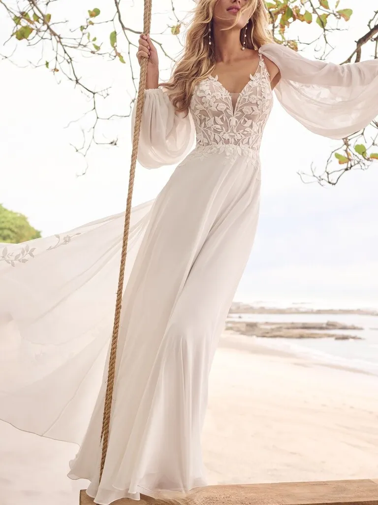 Confeccionado en muselina italiana, su ligereza acompaña el movimiento con un aire etéreo y natural, este vestido de novia corte A respira romanticismo en cada detalle. La parte superior presenta un escote corazón profundo, trabajado con bordados de pequeñas flores que realzan el busto con delicadeza.