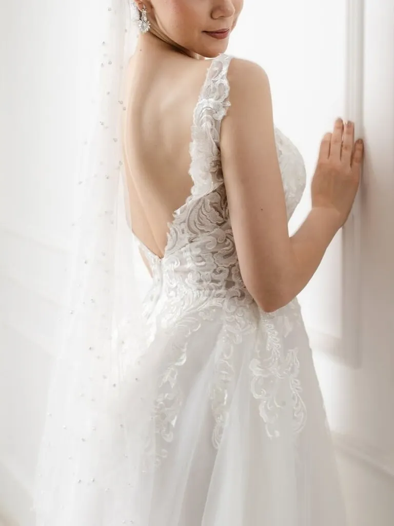 La parte superior presenta un trabajo de corsetería estructurada, que brinda soporte y realce perfecto. El frente forrado aporta sobriedad, mientras que la espalda transparente con breteles finos suma ligereza y un aire contemporáneo. Un diseño ideal para novias que buscan una pieza refinada, romántica y con detalles que hacen la diferencia