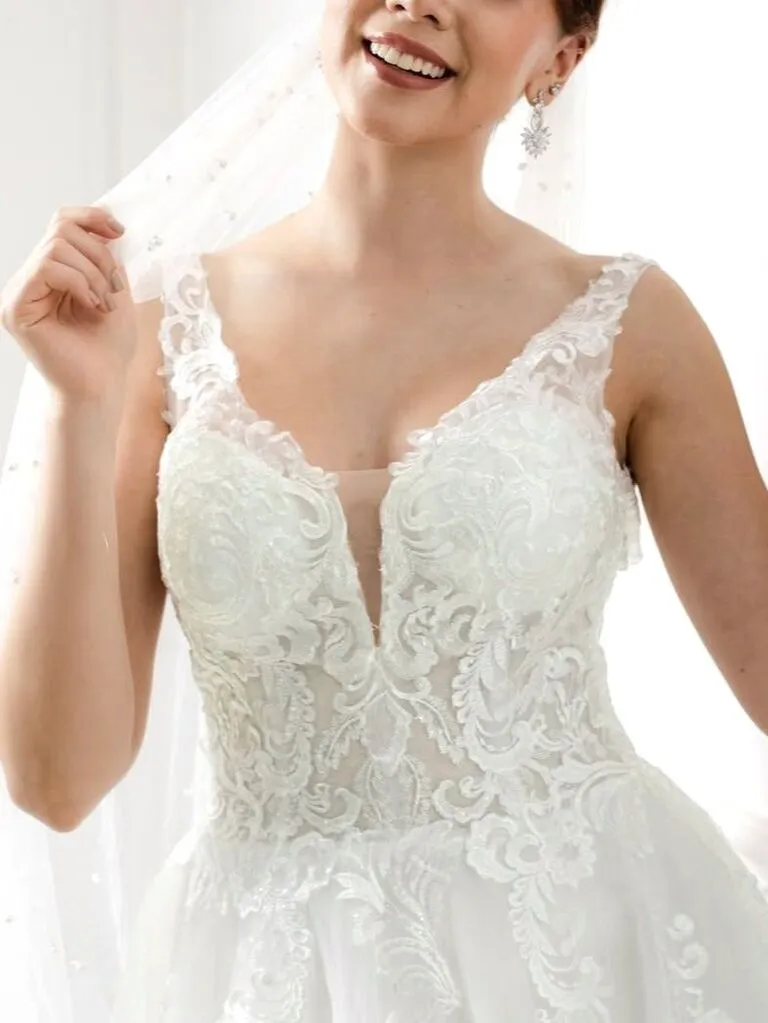 Su diseño está confeccionado en tul bordado con delicados arabescos que recorren toda la silueta, aportando textura y sofisticación. La falda incluye una capa de brillos bajo el tul, que genera destellos suaves al movimiento, envolviendo a la novia en una atmósfera mágica. Un vestido de novia corte A que combina elegancia y modernidad con un toque de luminosidad sutil.