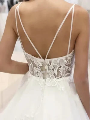 Frescura y romanticismo se combinan en este vestido de novia corte A. Confeccionado en tul ligero, su falda acompaña cada movimiento con suavidad. La parte superior destaca con un escote en V profundo y tul de transparencia, que estiliza y realza la silueta con un toque moderno y sensual.