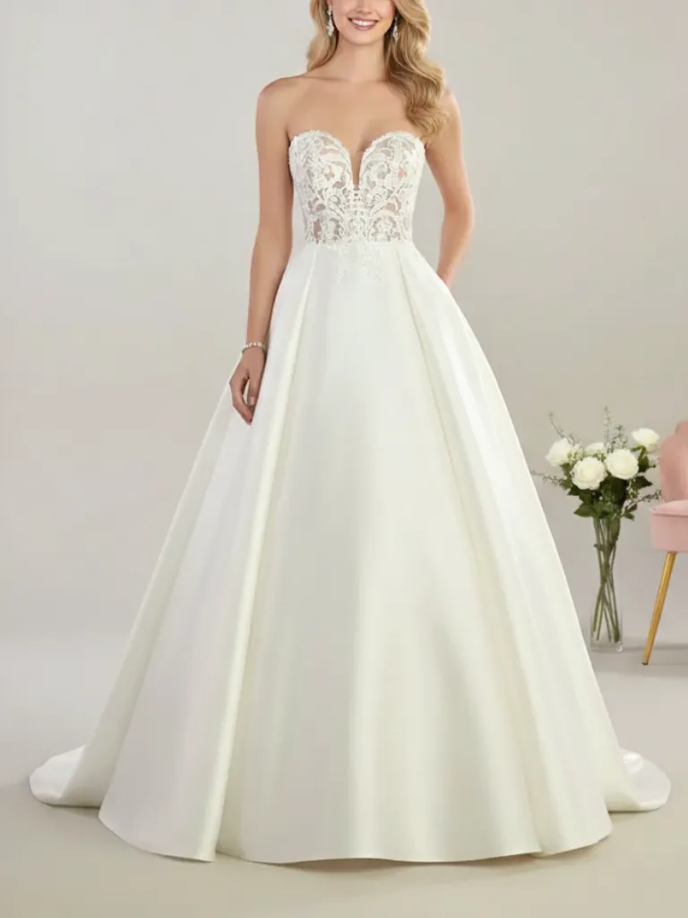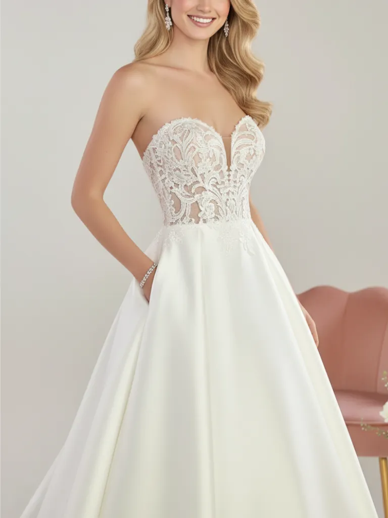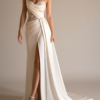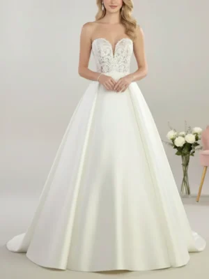 Un vestido majestuoso y sofisticado. Este vestido de novia corte princesa está confeccionado en mikado de seda, con una estructura impecable que resalta la silueta y aporta un aire regio. La parte superior presenta delicados bordados con pedrería, su escote corazón se complementa con unas mangas caídas desmontables, que transforman el diseño con versatilidad.