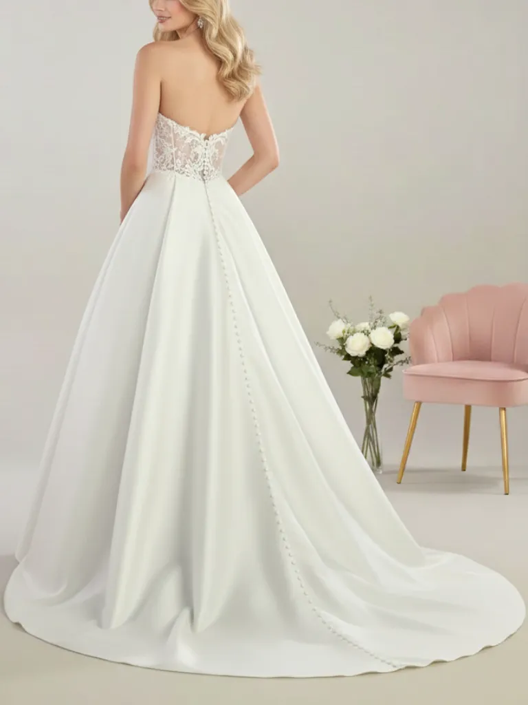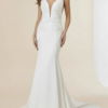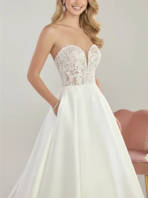 La falda amplia con bolsillos y botones hasta el final de la cola, equilibra la elegancia clásica del mikado con un toque moderno y divertido. Su cola amplia y fluida enmarca cada paso, convirtiendo a este vestido en una obra de impacto ideal para novias que sueñan con un look distinguido, imponente y lleno de encanto.