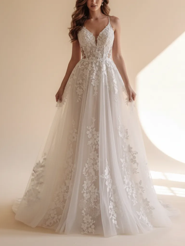 Este vestido de novia corte princesa deslumbra por la delicadeza de su falda en capas de tul, con bordados que se despliegan suavemente por todo el top y la falda.