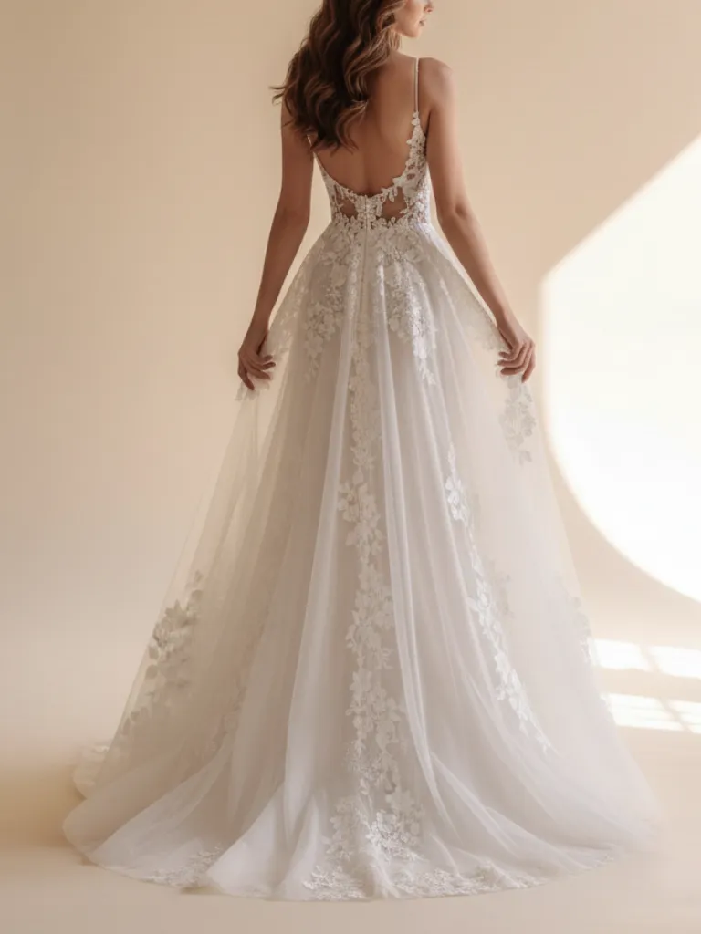 La espalda posee un escote ilusión con bordados que aporta un aire romántico y sofisticado, perfecto para novias que buscan elegancia y feminidad en su gran día.