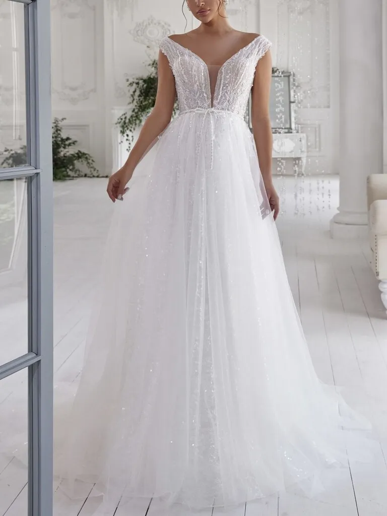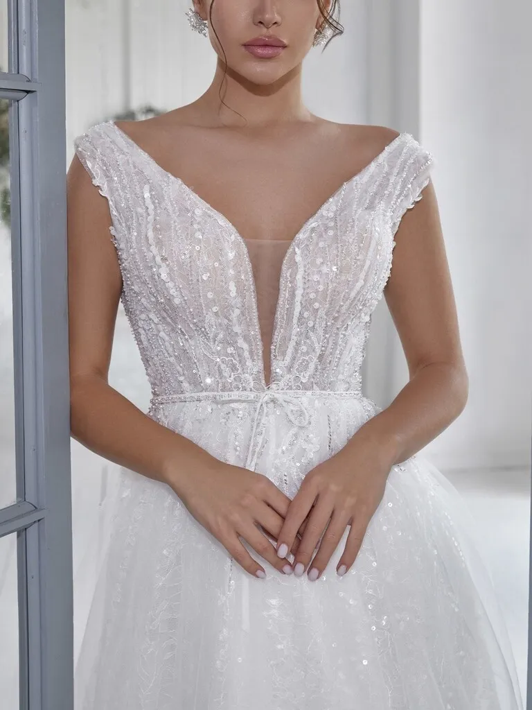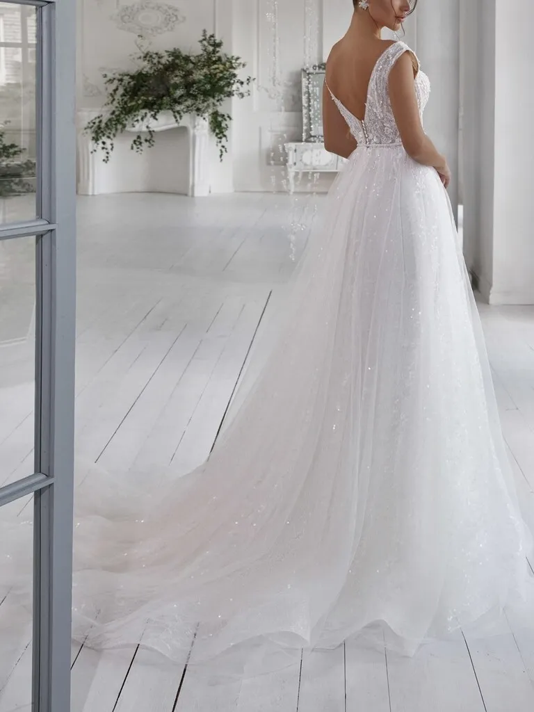 El vestido de novia Leonor se distingue por su línea elegante y equilibrada que va de hombro a hombro, terminando en un escote en V profundo que estiliza y realza el torso. Su corpiño está completamente bordado en pedrería, con un delicado efecto de ramificación que se extiende suavemente hacia la falda. La confección en tul incluye una capa intercalada de brillos sutiles, que ilumina el diseño y aporta un aire sofisticado y actual a un vestido de novia corte princesa lo convierte en una propuesta ideal para novias que buscan un look elegante con destellos de romanticismo.