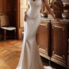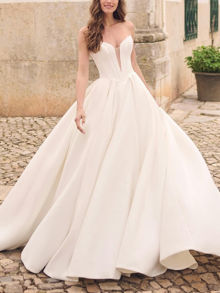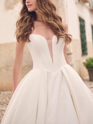 La elegancia del micado de seda natural se luce en este vestido de novia corte princesa, que combina estructura y movimiento en perfecto equilibrio. Su escote strapless en corazón profundo resalta la silueta con un aire clásico y sofisticado, mientras que el corset completamente emballendo con terminación en V suave aporta firmeza y feminidad.