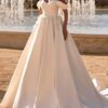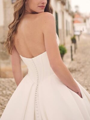 La falda, amplia y semiarmada, despliega tablones que le dan volumen con naturalidad e incorpora bolsillos laterales ocultos, un detalle moderno y práctico. En la espalda, una fila de delicados botones recorre todo el largo hasta culminar en la cola, aportando un toque romántico y atemporal. Para un plus de encanto, el diseño admite mangas desmontables plisadas, que suman dramatismo y versatilidad.