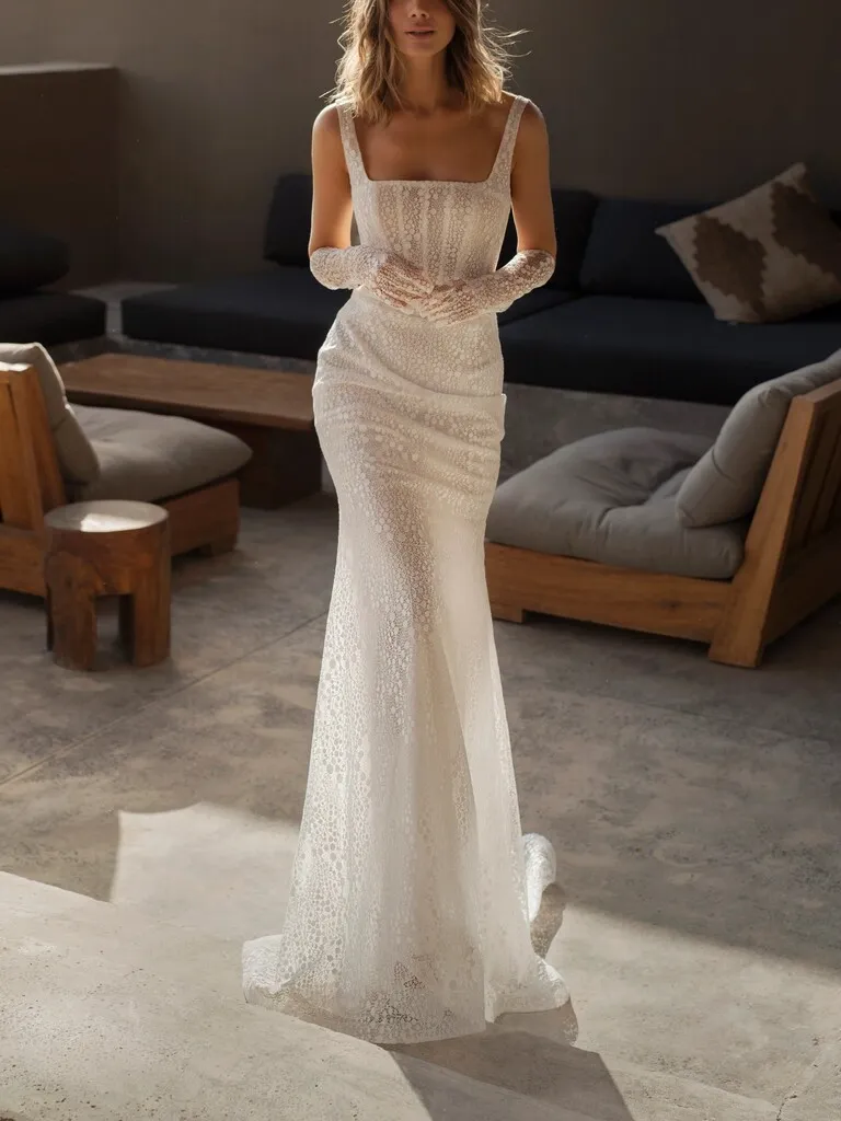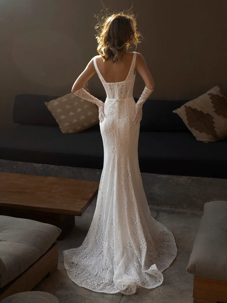 Un vestido que combina elegancia moderna y frescura. Confeccionado en tul fantasía con delicado diseño circular, este vestido corte sirena realza la silueta de manera sutil y femenina. El escote cuadrado con corset entallado y varillas aporta estructura, mientras que la espalda baja añade un toque sensual al diseño. La falda abraza las caderas y se abre suavemente hacia el ruedo, otorgando libertad de movimiento y una caída fluida. Ideal para novias que buscan un look sofisticado, actual y perfecto para ceremonias al aire libre o bodas de día y con un sutíl toque fashionista.