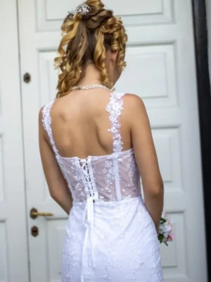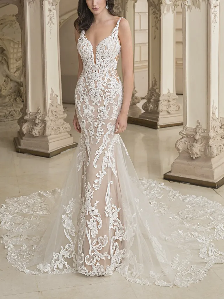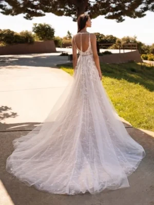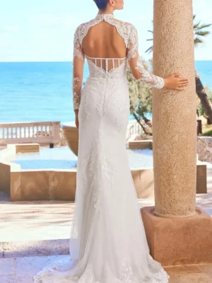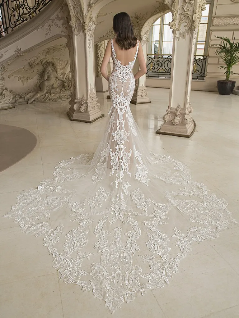 El tul bordado cobra protagonismo en este vestido, haciéndolo destacar con su corte y sus transparencias. Un escote profundo estiliza el top, su diseño lateral contornea la cintura y su espalda con botones lo vuelven único. La falda se ciñe y abre en suave campana con cola catedral. Sofisticado vestido corte sirena para novias audaces.