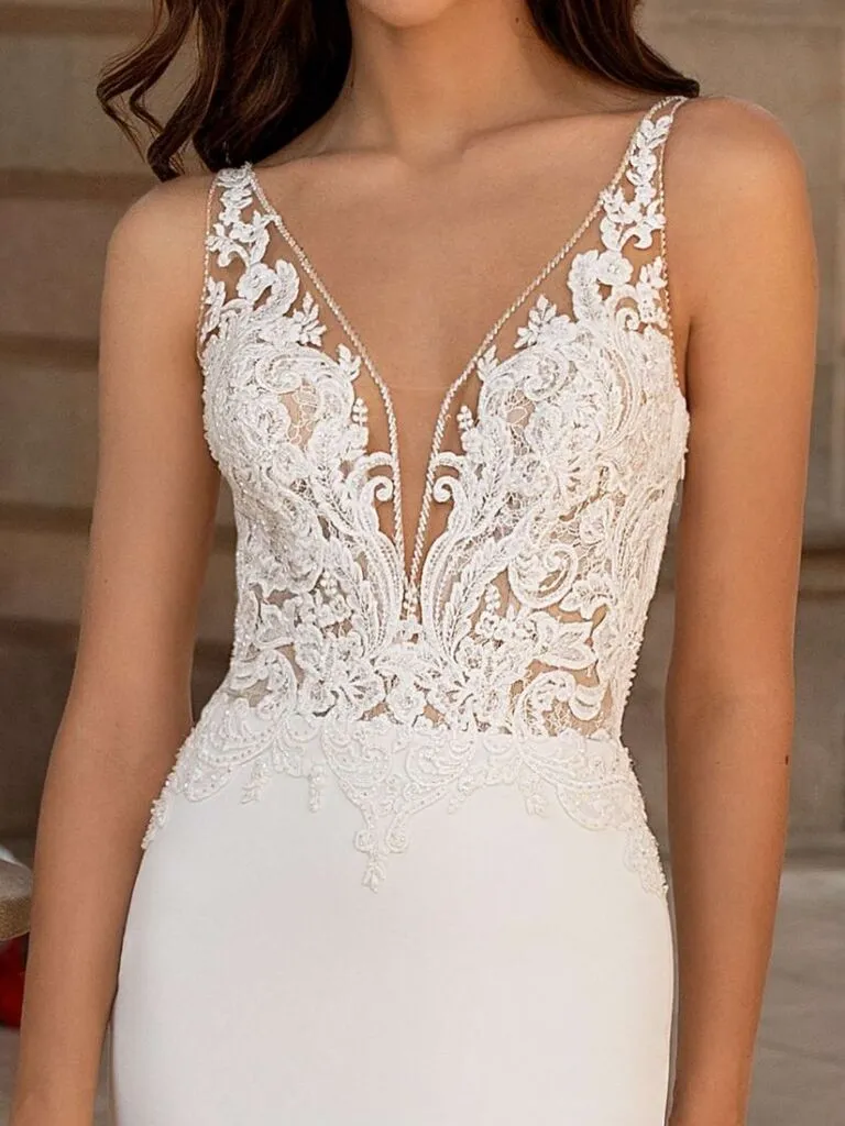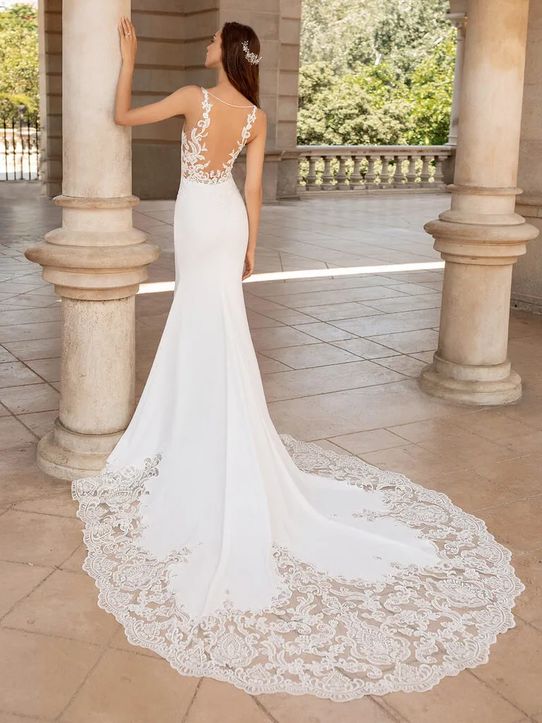 Sofisticación y encanto atemporal distinguen a este vestido de novia corte sirena. Confeccionado en crêpe de seda pesada, abraza la figura con elegancia antes de abrirse en una falda con bordados en ruedo y cola, logrando un efecto majestuoso.