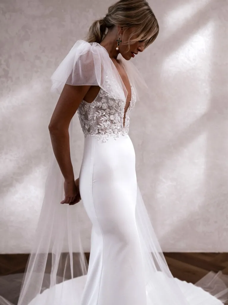 Un vestido de novia de corte sirena que irradia delicadeza y sofisticación. Su parte superior está trabajado en tul finamente bordado con canutillos y lentejuelas, creando un brillo sutil que realza cada movimiento. Los breteles delgados acompañan un escote profundo en V aportan un toque sensual y refinado. Las alas de tul removibles caen suavemente desde los hombros, generando una silueta etérea y una sensación de ligereza al caminar. La espalda se completa con una hilera de delicados botones forrados que añaden un aire clásico y romántico. Ideal para novias que buscan elegancia y distinción pero con un toque de diseño contemporáneo.