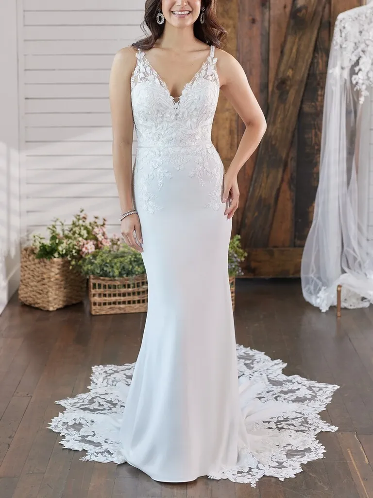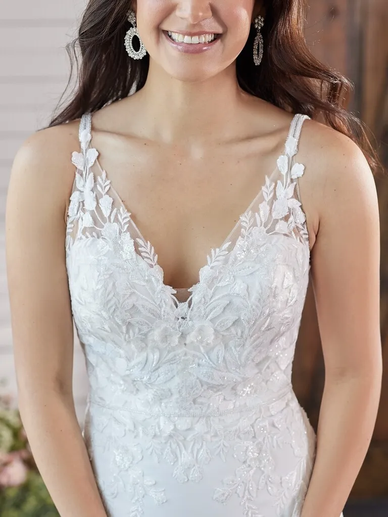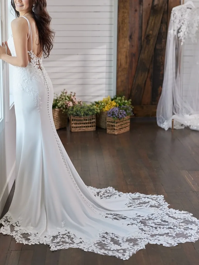 La simplicidad se vuelve sofisticada en este vestido de novia de líneas limpias que realza la silueta de forma sutil y femenina. Su escote en V profundo estiliza el torso, mientras que los breteles dobles y finos aportan un detalle delicado y diferente. La espalda con suaves transparencias enmarca una hilera de pequeños botones que desciende hasta una cola trabajada con encajes y aplicaciones florales, que le dan el toque de romanticismo perfecto. Ideal para novias que buscan un vestido corte sirena elegante y atemporal con un detalle distintivo en la parte posterior.