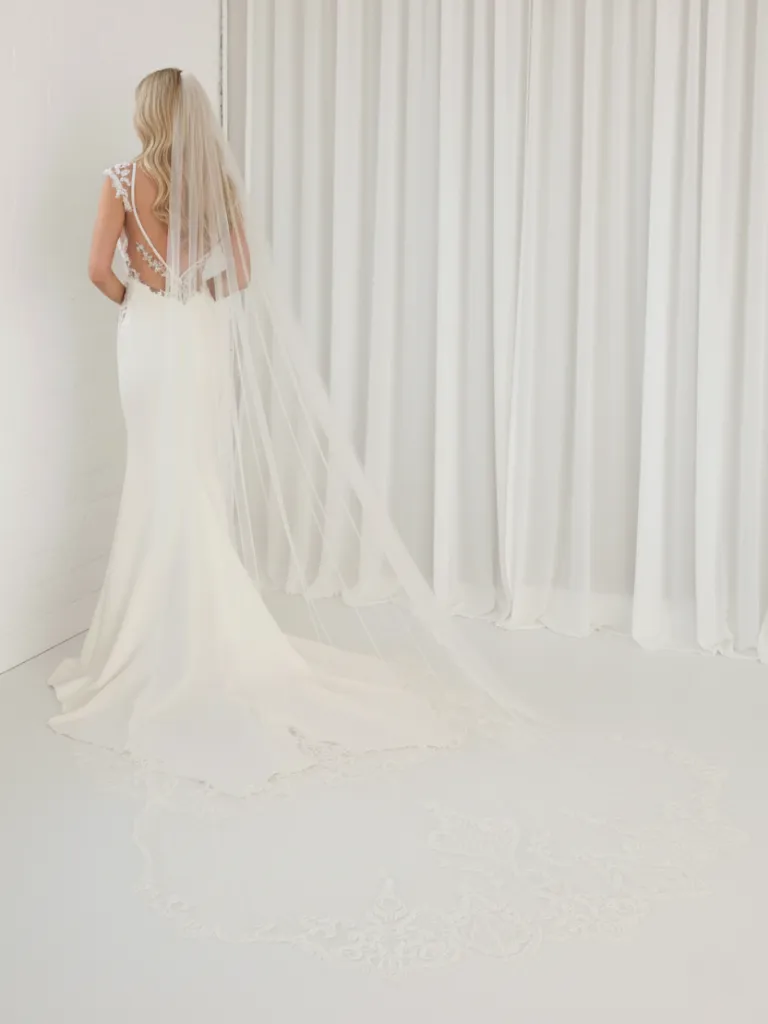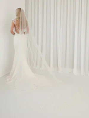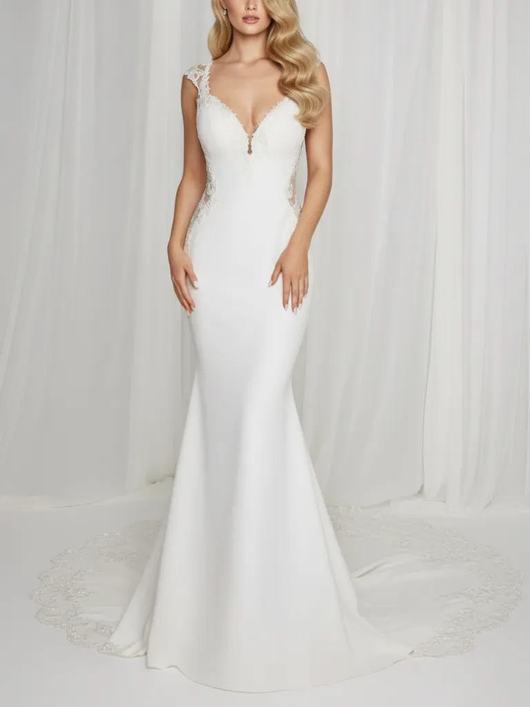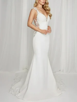 Este vestido de novia de corte sirena fusiona elegancia y sensualidad. Su corset con escote corazón resalta el busto y se complementa con delicadas transparencias laterales que afinan la cintura. Los breteles bordados y su espalda profunda aportan un toque de sensualidad y elegancia. La falda se ciñe suavemente a la silueta antes de abrirse en una cola de impacto, terminada con un imponente borde de encaje que añade romanticismo y sofisticación. La hilera de pequeños botones en la espalda aporta un detalle clásico y atemporal.