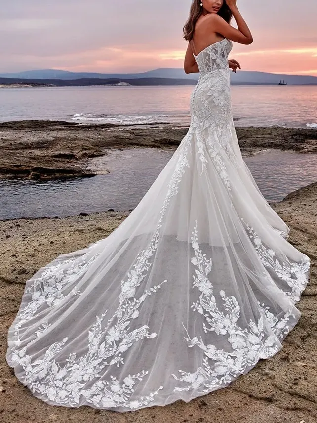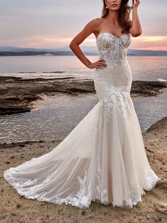 Un diseño de vestido de novia que combina romanticismo y fuerza visual. El corset estilo bustier con escote corazón resalta el busto y estiliza el torso, La espalda se realza con una delicada línea de botones forrados que aportan a este vestido corte sirena un toque clásico y femenino ,mientras que la falda de corte trompeta abraza la silueta y se abre en una cola amplia y bordada que genera un efecto impactante al caminar. Todo el contorno está trabajado en delicados bordados, realzando la femineidad del diseño. Como detalle adicional, se pueden sumar mangas tipo globo desmontables en tul, ideal para transformar el look entre la ceremonia y la fiesta
