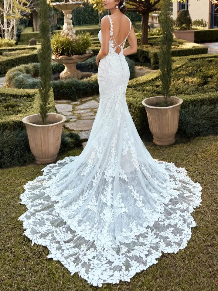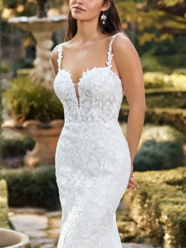 Corsé con paneles ilusión y encaje floral define el torso; la espalda con cordonera ajusta a medida. La falda lisa se abre en cola fluida que estiliza. Un vestido de novia corte sirena sensual y romántico, pensado para resaltar curvas con elegancia y lograr un ajuste impecable.