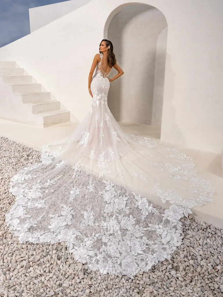 Este sofisticado vestido de novia corte sirena es pura poesía visual. Los apliques de flores 3D se mezclan con el tul bordado, creando una textura romántica y delicada. El escote en V profundo estiliza el torso, mientras que la espalda con transparencias y botonadura forrada realza la silueta con elegancia. La falda abraza las curvas y se abre en una imponente cola completamente bordada, que aporta movimiento y dramatismo al caminar. Ideal para novias que buscan un look etéreo, femenino y de alto impacto.
