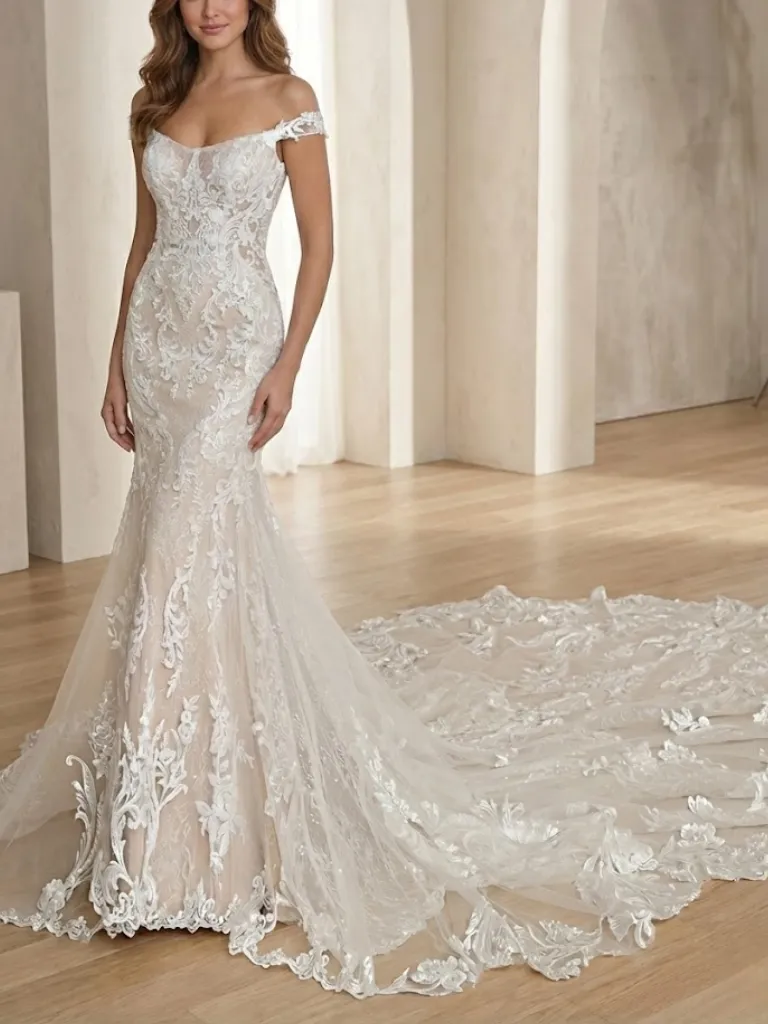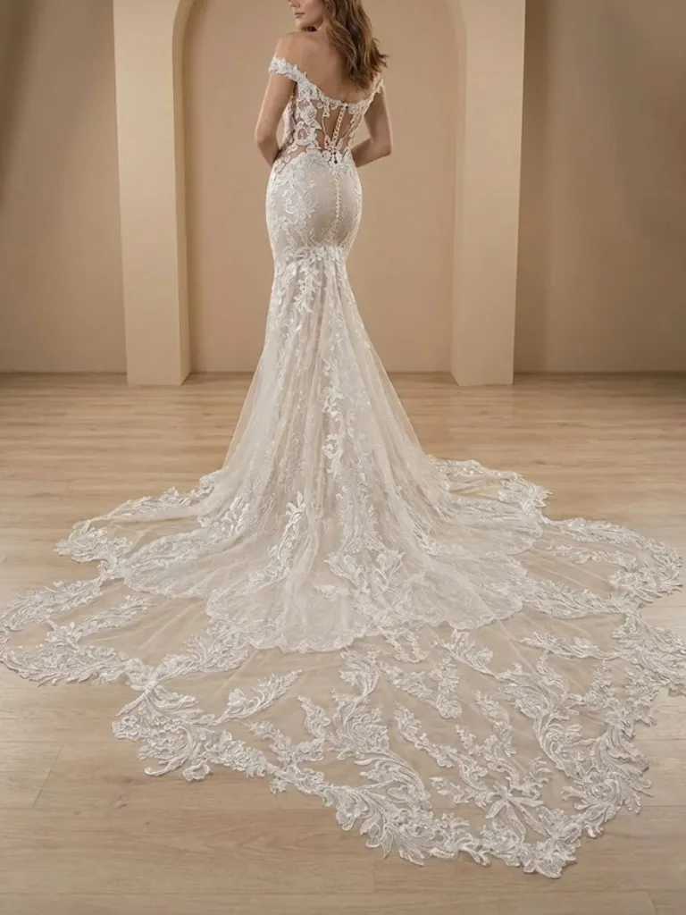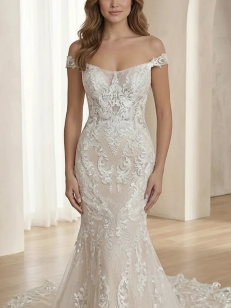 Un diseño que respira romance y feminidad. Este vestido de novia corte sirena está confeccionado en tul bordado con delicadas mangas caídas removibles y posee un escote recto que enmarca el busto de manera elegante. La silueta abraza las curvas y abre su amplitud a media pierna, generando comodidad y realzando el movimiento. Todo el ruedo y la cola con terminación bordada aportan un efecto fluido y sofisticado. Ideal para novias que buscan un look clásico y delicado, con un toque de sensualidad, y que priorizan poder moverse y bailar con comodidad durante toda la celebración.