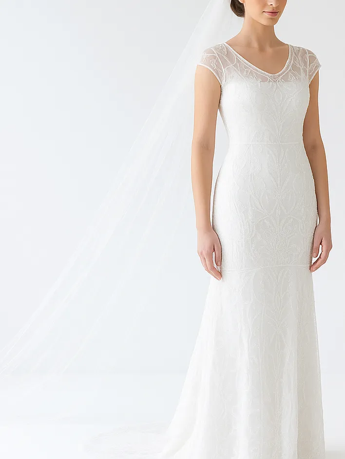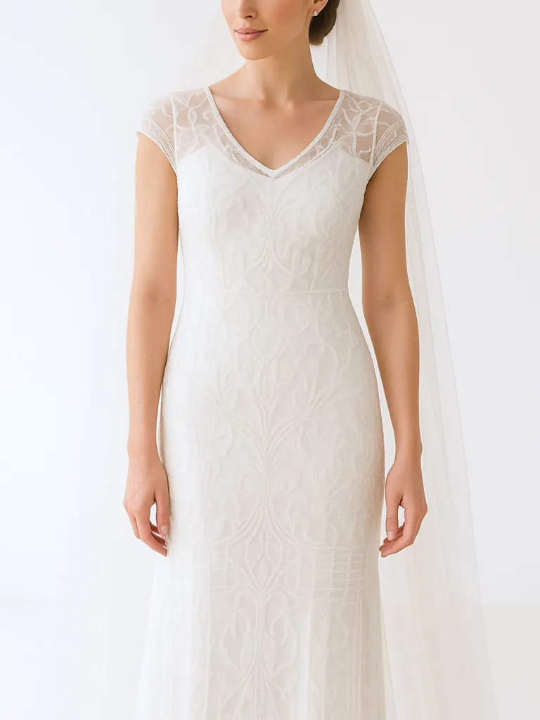 Vestido con encaje geométrico perlado de aire vintage y mangas cap dibujan una figura esbelta. Escote en V y cola suave aportan romanticismo sutil. Un vestido de novia corte sirena luminoso y delicado, ideal para novias que desean brillar con elegancia sin excesos, priorizando comodidad y encanto atemporal.