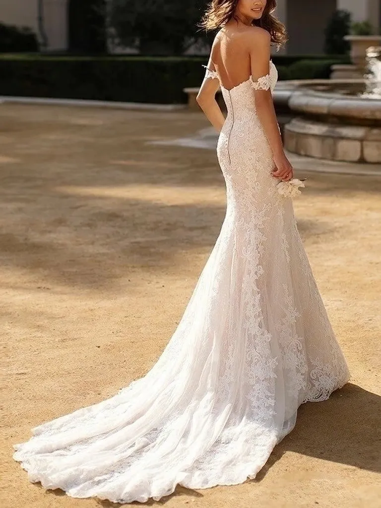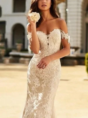 Romántico y sensual, este vestido de novia corte sirena está confeccionado en tul bordado con delicadas mangas caídas y escote corazón que enmarca el busto. El diseño entalla la silueta y abre su amplitud a media pierna, otorgando comodidad al caminar y realzando el movimiento de la falda. La amplia cola con terminación bordada aporta un efecto soñado y sofisticado. Ideal para novias que sueñan con un look clásico, femenino y cautivador.