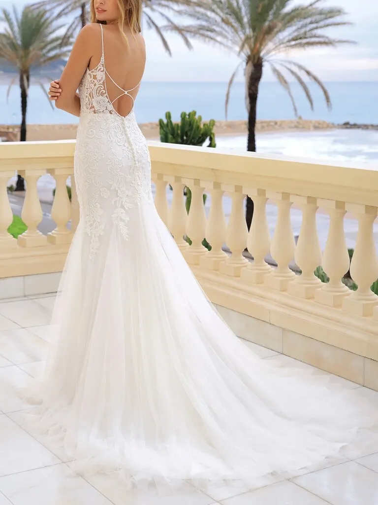 Ligero y romántico, este vestido de novia corte sirena trompeta es ideal para ceremonias al aire libre. Confeccionado en tul bordado delicados, se ajusta suavemente a la silueta y se abre en un vuelo liviano que facilita el movimiento. El escote profundo con transparencias estiliza el torso, mientras que los finos breteles bordados y la espalda con con un detalle único y moderno. La cola de tul liviano aporta movimiento y frescura, perfecto para novias que buscan un look fresco y moderno, sin resignar comodidad en su gran día.