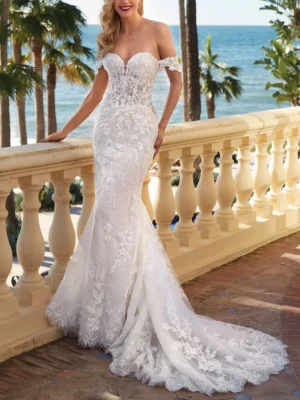 Un diseño de ensueño que combina feminidad y romanticismo. Este vestido de novia corte sirena presenta un escote corazón profundo con delicadas aplicaciones de tules bordados que realzan el busto. La silueta abraza la figura con bordados de diseños florales que recorren todo el largo hasta abrirse en una cola vaporosa y elegante. La sobrefalda desmontable añade dramatismo y convierte el look en un verdadero impacto nupcial, mientras que las mangas opcionales aportan un aire sofisticado y versátil. Ideal para novias que buscan un look glamoroso con la opción de transformarlo durante su gran día.