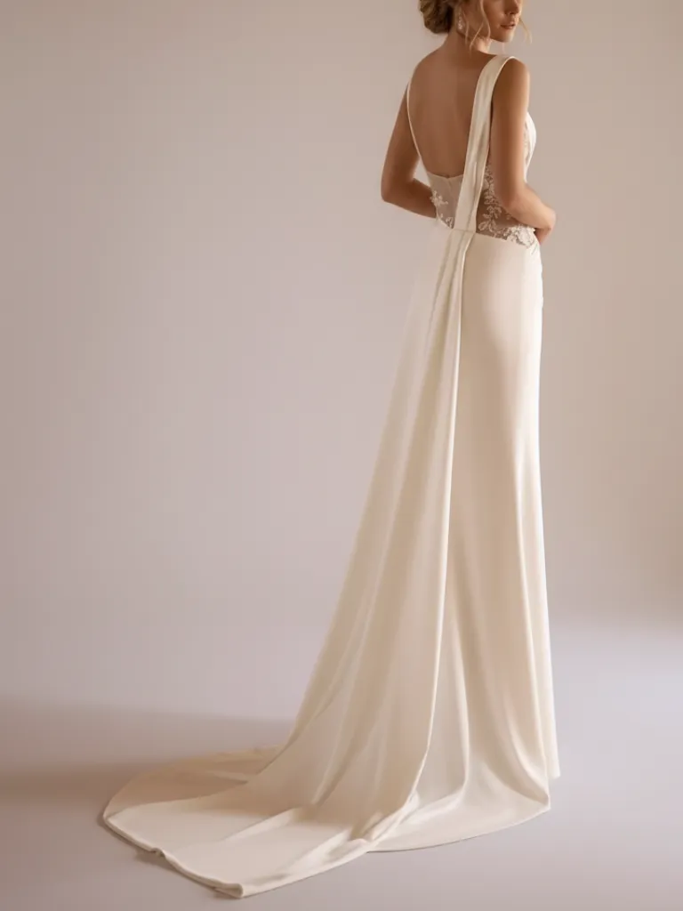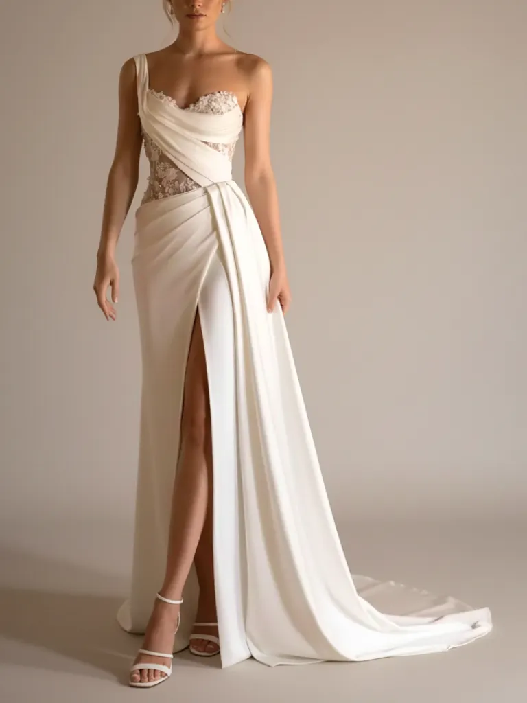 Este vestido de novia corte sirena realza la silueta con un delicado drapeado en el corset y bordados que dan brillo y sofisticación. La falda con tajo lo vuelve algo único y su sobrefalda opcional lateral desmontable te permite tener dos diseños en uno, otorgando un aire clásico y refinado. El escote corazón enmarca el busto de manera impecable, acompañado del drapeado de un hombro, que suma romanticismo y feminidad. Es un diseño perfecto para novias que desean versatilidad y protagonismo, viviendo cada momento de su gran día con distinción.
