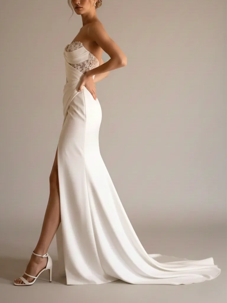 Vestido sirena con tajo en mikado y bordados con drapeado