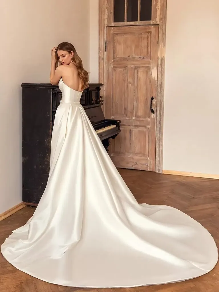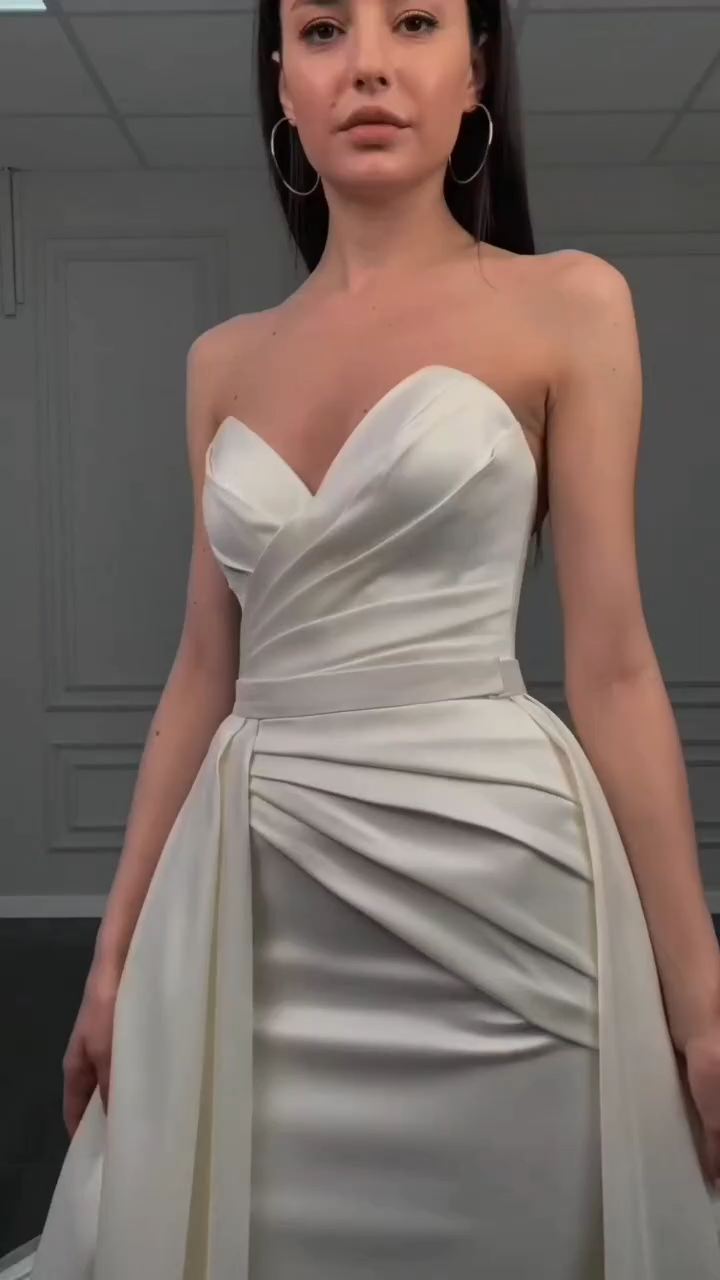 Este vestido de novia corte sirena de estilo minimalista y con opción dos en uno realza la silueta con un delicado drapeado en el corset y la falda que aporta armonía y elegancia. El escote corazón enmarca el busto de manera impecable, acompañado de mangas caídas removibles que suman romanticismo y feminidad. La cola, adornada con botones hasta el final, otorga un aire clásico y refinado. La sobrefalda desmontable transforma el diseño en un look de alto impacto, perfecto para novias que desean versatilidad y protagonismo, viviendo cada momento de su gran día con distinción.